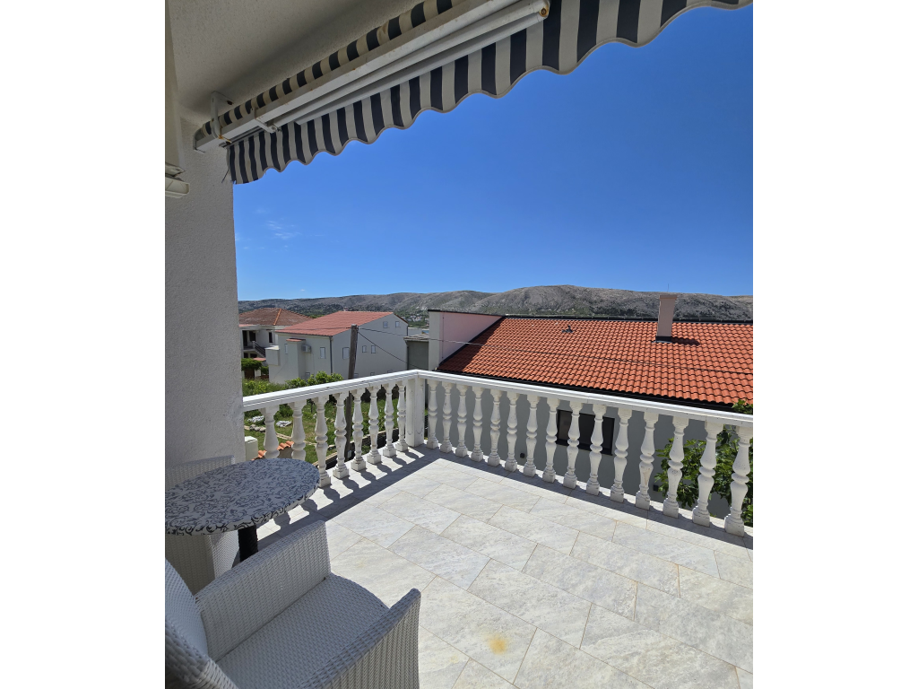Ein zweistöckiges Apartment mit zwei Schlafzimmern für 4 Personen, ganz in der Nähe des historischen Zentrums und dennoch getrennt vom Sommertrubel der geschäftigen Stadt Pag. Die Erdgeschosswohnung verfügt über eine komplett eingerichtete Küche mit Spülmaschine, ein Wohnzimmer mit TV/SAT und ein Esszimmer, alles in einem Raum, in dem sich auch die erste Klimaanlage befindet, ein zusätzliches WC mit Waschmaschine, eine Terrasse mit Gasgrill und Zugang zu einem kleinen Garten mit jungen Feigenbäumen. Im zweiten Stock gibt es zwei Schlafzimmer; Eines verfügt über ein Doppelbett mit TV/SAT und Klimaanlage und dieses Zimmer öffnet sich zu einem schönen Balkon mit Markise. Das zweite Schlafzimmer ist für Kinder und verfügt über ein Einzelbett, aus dem ein weiteres Einzelbett ausgezogen werden kann. Auf der gleichen Etage befindet sich ein großes Badezimmer mit Dusche und separater Klimaanlage. Vor der Eingangstür der Wohnung befindet sich eine Außendusche. Parkplätze und WLAN stehen zur Verfügung.